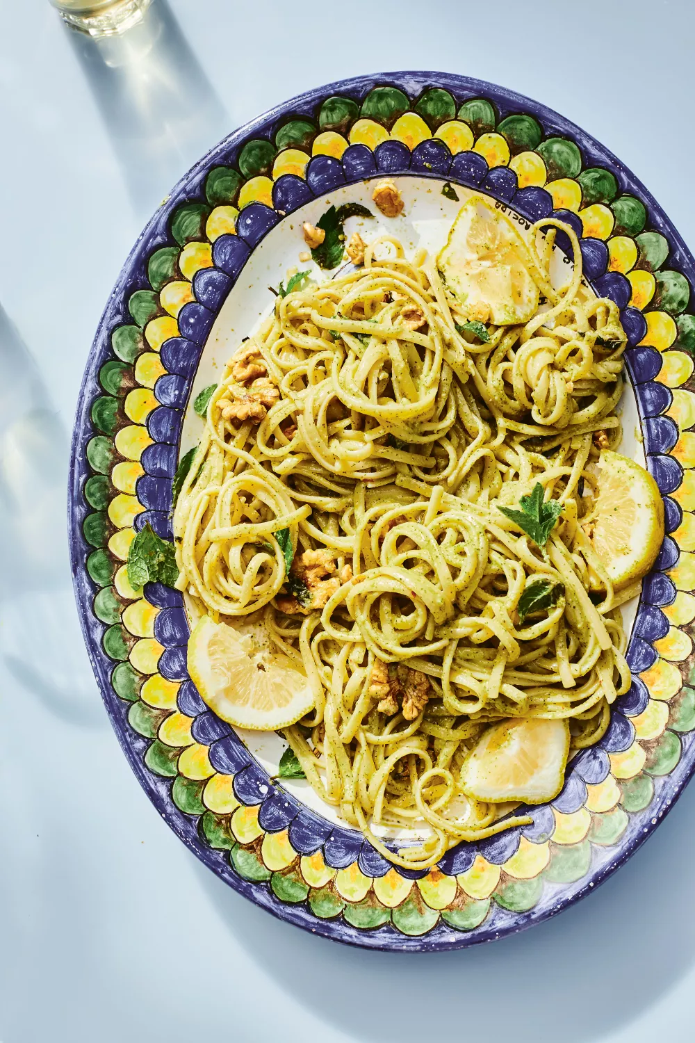 Deze frisse spaghetti met citroenpesto combineert intense citroenschil met romige Parmezaan en krokante pijnboompitten voor een lichte, zomerse pastamaaltijd. Met munt en bladpeterselie, een scheut olijfolie en een vleugje knoflook maak je in de keukenmachine snel een geurige pesto die je met heet pastawater tot een glanzende saus brengt. Perfect als snelle doordeweekse maaltijd of verfijnde lunch bij zonnig weer.