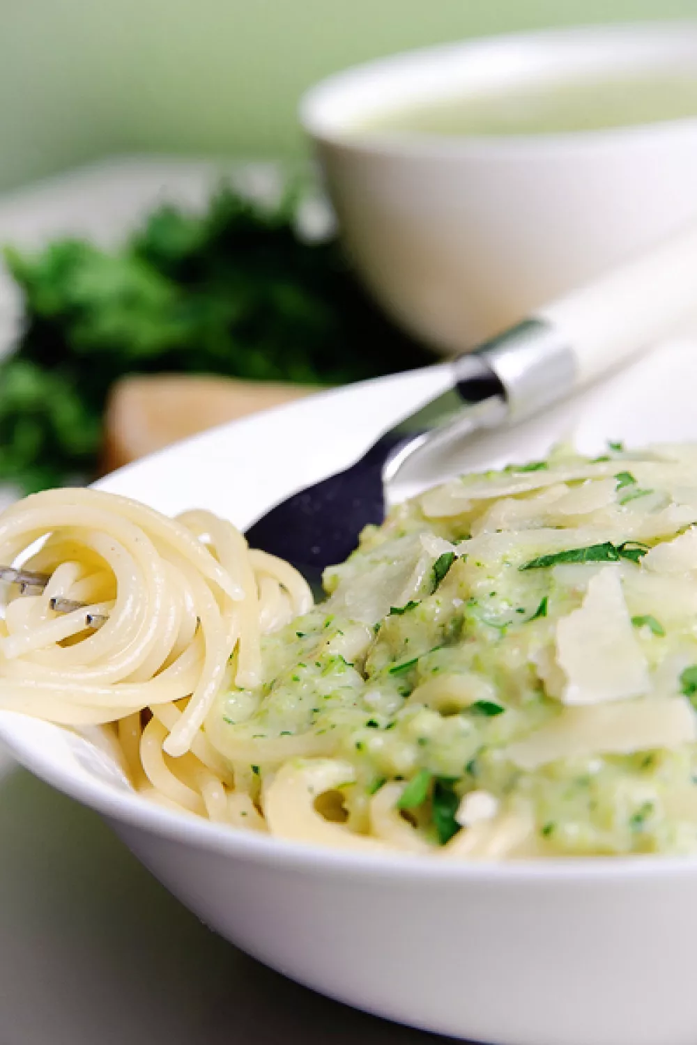 Romige spaghetti met courgettesaus combineert zachte, gepureerde courgette met een klassieke roux en Parmezaanse kaas voor een snel en troostrijk pastagerecht. Door ui en knoflook zacht te fruiten en de courgette te pureren ontstaat een fluweelachtige, vegetarische saus die ideaal is voor een doordeweekse maaltijd of lichte zomeravond. Werk af met verse peterselie en versgemalen peper.