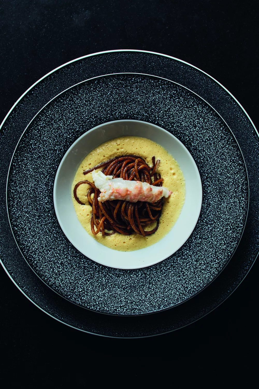 Bedek nu de bodem van de warme borden met een laag je warme sabayon. Draai met een grote vork de spaghetti, met behulp van een soeplepel, tot vier torentjes en leg deze in het midden van de borden op de sabayon. Leg de langoustines boven op de pastatorentjes en serveer onmiddellijk.