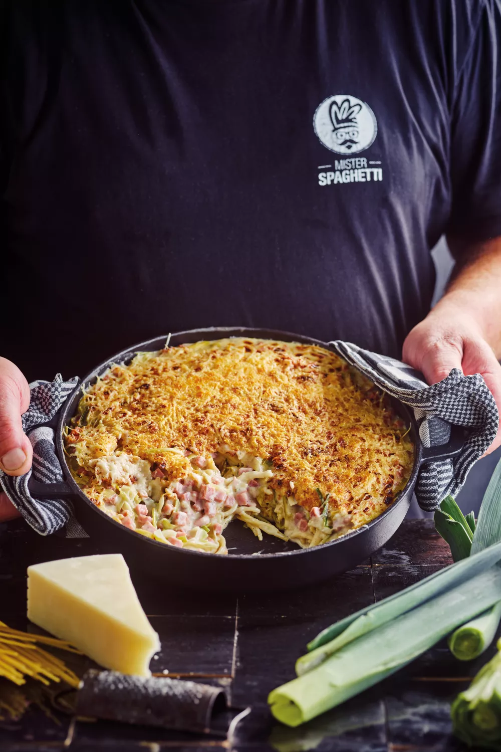 Romige spaghetti met prei en ham in een rijke kaassaus, afgewerkt met een goudbruin gratinkorstje uit de oven. Deze hartige ovenschotel combineert emmentaler, Parmezaan en pecorino voor volle smaken en nootmuskaat geeft een warme toets. Perfect als gezellig familiediner of comfortfood op koele herfst en winteravonden.