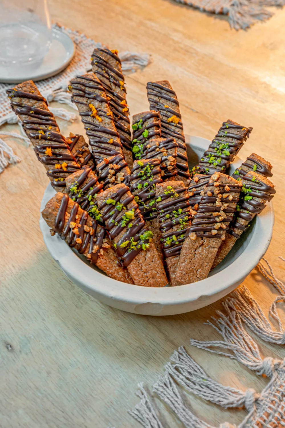 Werk de speculaaskoekjes af met chocoladelijntjes, bresiliennenootjes, pistache en sinaasappelzeste.