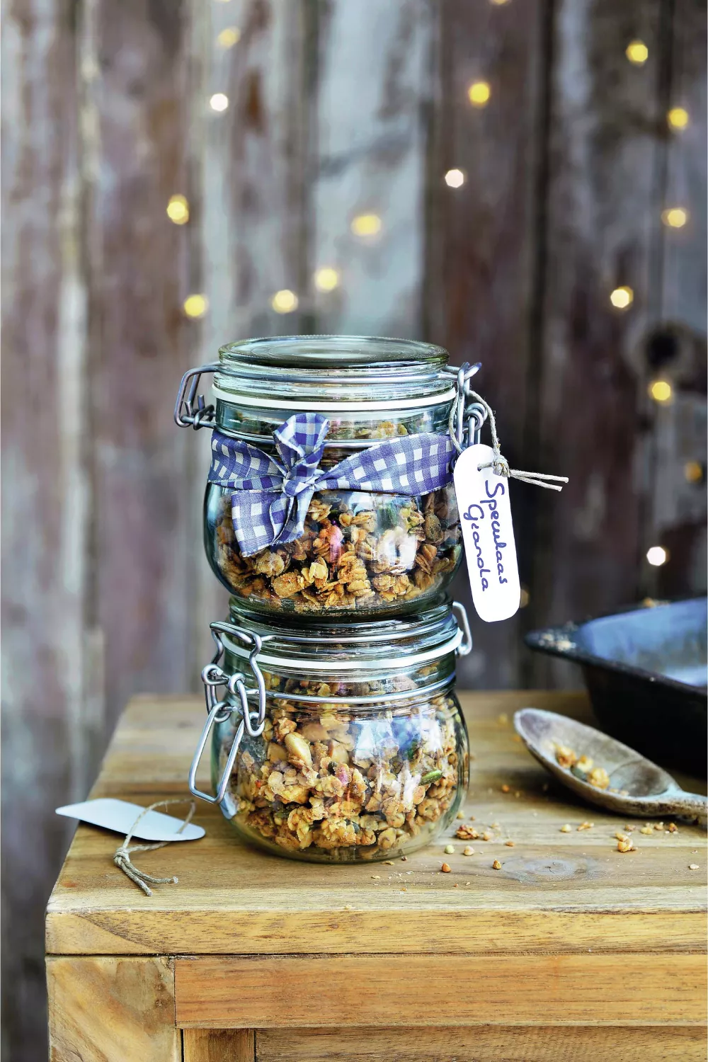 Speculaas granola met amandelen, haver, boekweit en pompoenpitten verenigt warme speculaaskruiden, kaneel en zoete ahornsiroop tot een knapperig ontbijt of winterse snack. Ovengebakken op lage temperatuur en afgewerkt met kokosolie en amandelpasta krijgt de granola een goudbruine crunch en een romige toets. Heerlijk als topping op yoghurt of havermout en perfect voor gezellige ochtenden en feestdagen.