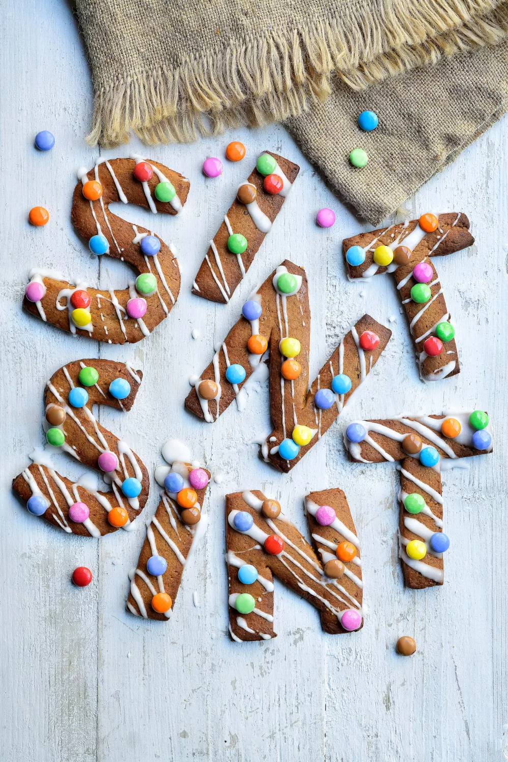 Leg de letters voorzichtig op een bakplaat bekleed met bakpapier en schuif ze in een voorverwarmde oven van 180°C gedurende 15 à 20 minuten. Laat afkoelen en versier de letters met glazuur en smarties.
