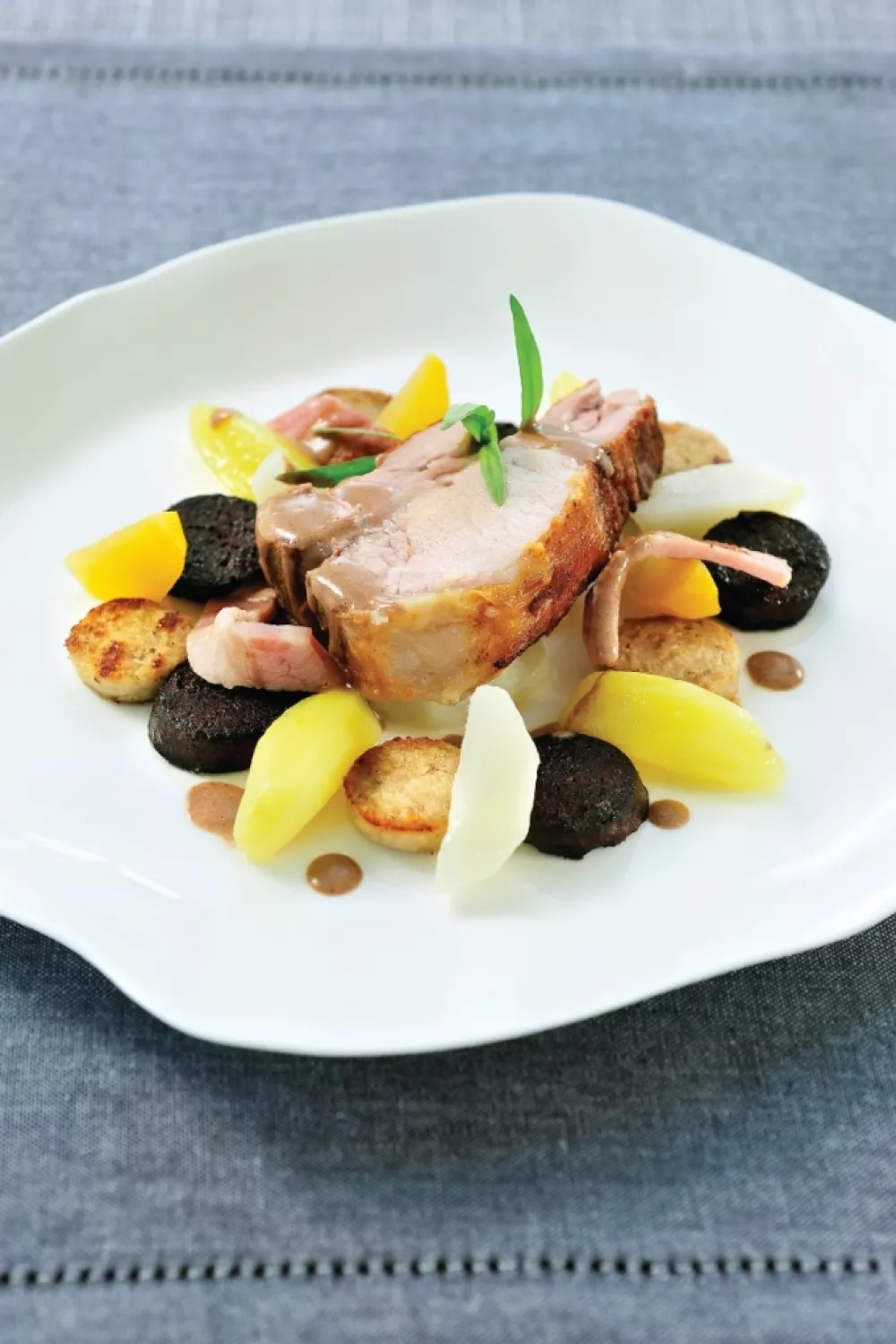 Een stevig bord uit de klassieke keuken met een goudbruin carré van speenvarken en krokant zwoerd, vergezeld van een rijke saus op basis van zwarte en witte pens, room en mosterd. Bijgerechten van opgebakken kleine aardappelen, gekookte rapen en zilveruitjes in reuzel geven een herfstachtige, huiselijke sfeer en passen prima bij een feestelijk familiediner of koude avond. De bereiding combineert schroeien, in de oven garen en het inkoken en zeven van een hartige penssaus voor volle smaak.