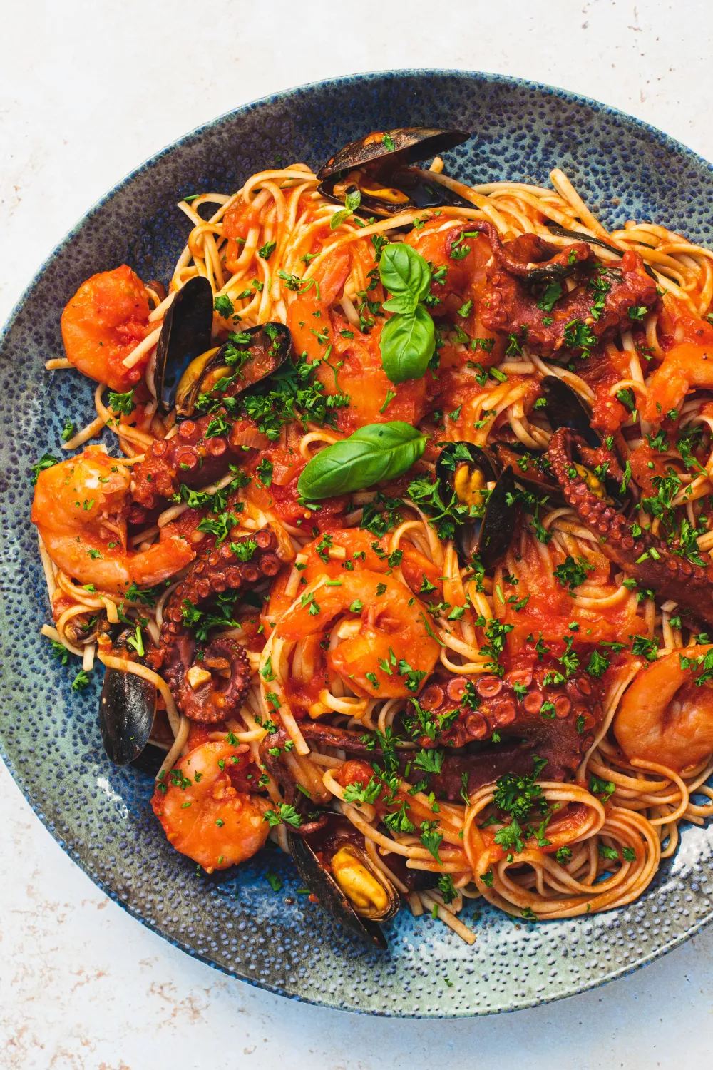 Deze kruidige linguine frutti di mare combineert een rijke San Marzano tomatensaus met knoflook, chilivlokken en zeevruchten zoals mosselen, gamba's en octopustentakels. De saus wordt langzaam ingekookt terwijl mosselen en gamba's kort gestoofd worden in witte wijn en citroen, waarna alles luchtig door de pasta wordt geschept met verse basilicum en peterselie. Perfect als zomers mediterraan diner of feestelijke pastamaaltijd voor vrienden.