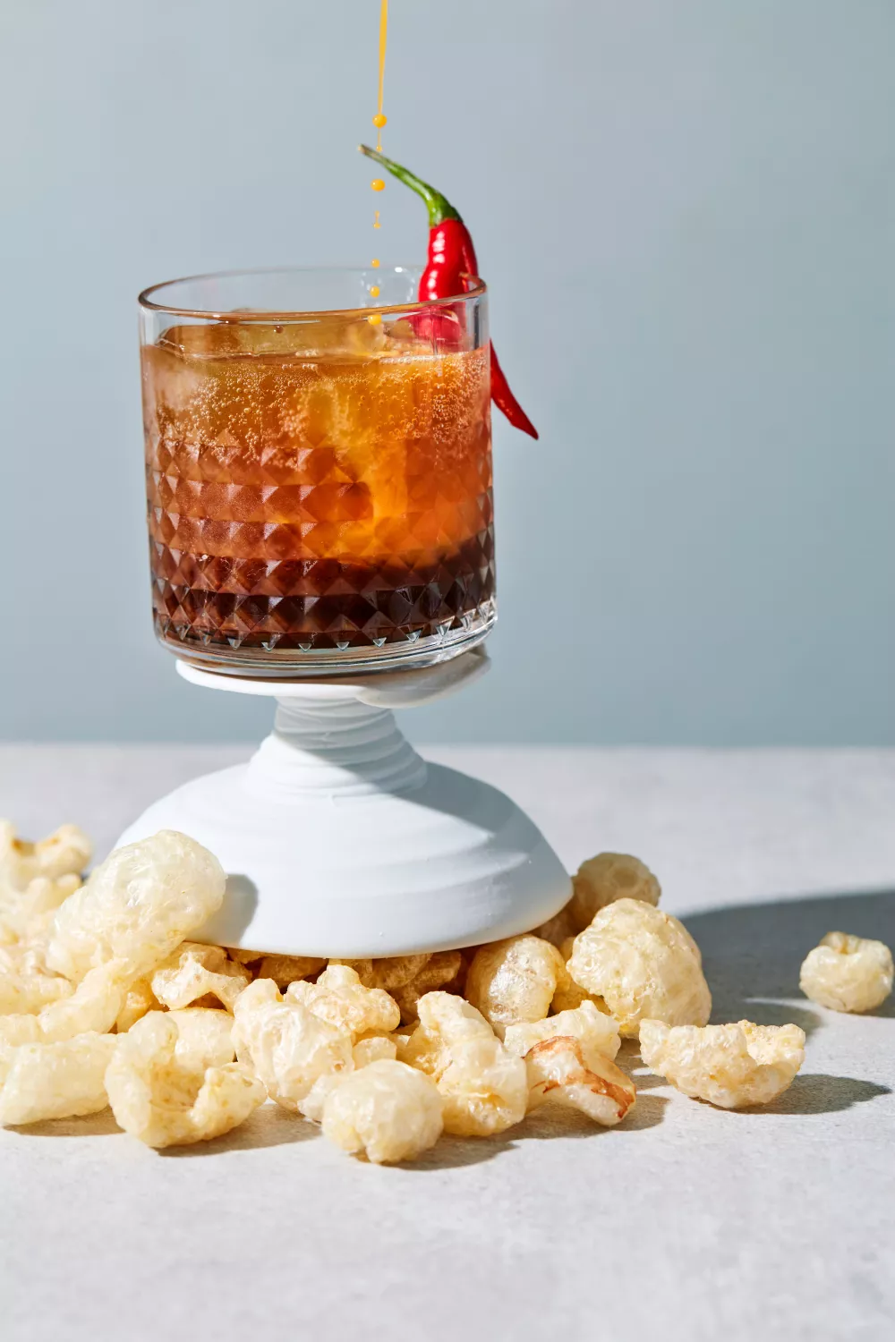 Verdeel het tamarindemengsel over glazen, je hebt als het goed is zo’n 65 milliliter per glas. Schep in elk glas ijsblokjes en vul de glazen aan met zo’n 75 milliliter bruiswater. Decoreer met een chilipepertje, of een takje munt voor mijn part.