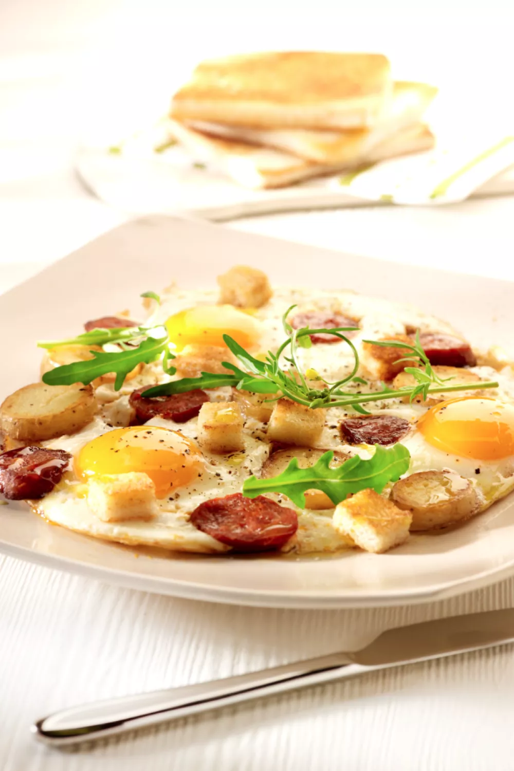 Spiegeleitjes met chorizo en knapperige broodcroutons