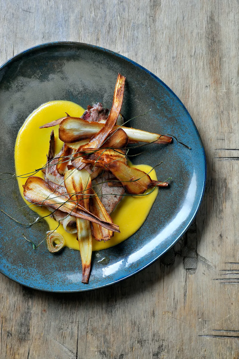 Snijd de spiering in reepjes. Schep de pompoencrème op het bord en schik het vlees er mooi bij. Overgiet het vlees met een lepeltje van de vleesjus en de uitjes. Werk af met de chips van pastinaak en de sprietjes bieslook.