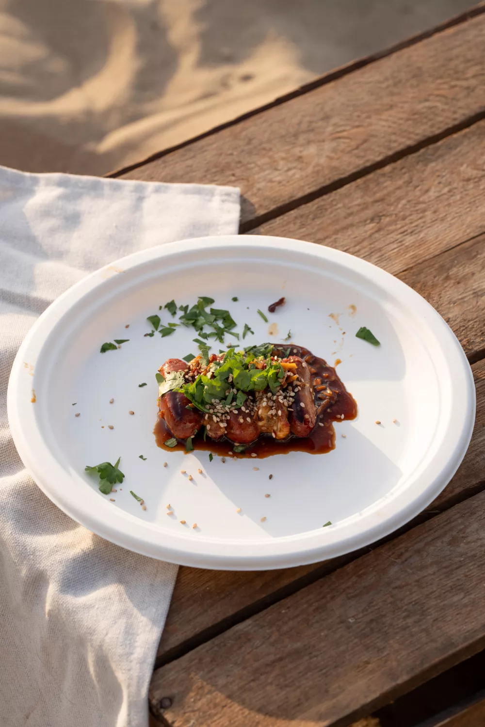 Verdeel de stukjes merguez en paling over bordjes. Werk af met extra saus, koriander, munt en sesamzaadjes.