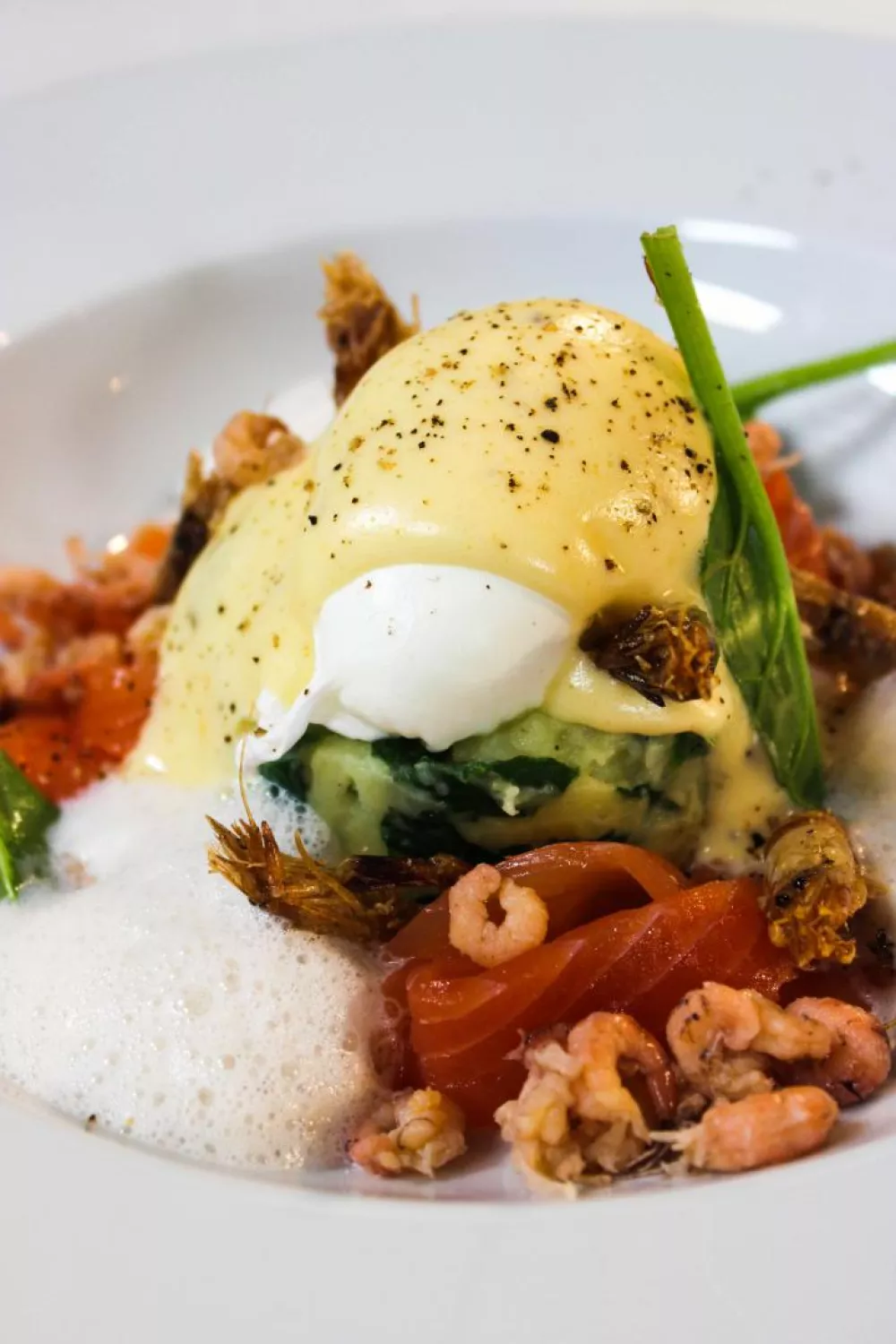 Plaats een dresseerring in het midden van het bord en schep hier de spinaziepuree in. Leg het gepocheerd eitje er bovenop en enkele plakjes gerookte zalm er rond. Werk af met de mousseline, het melkschuim en enkele gefrituurde garnalen.