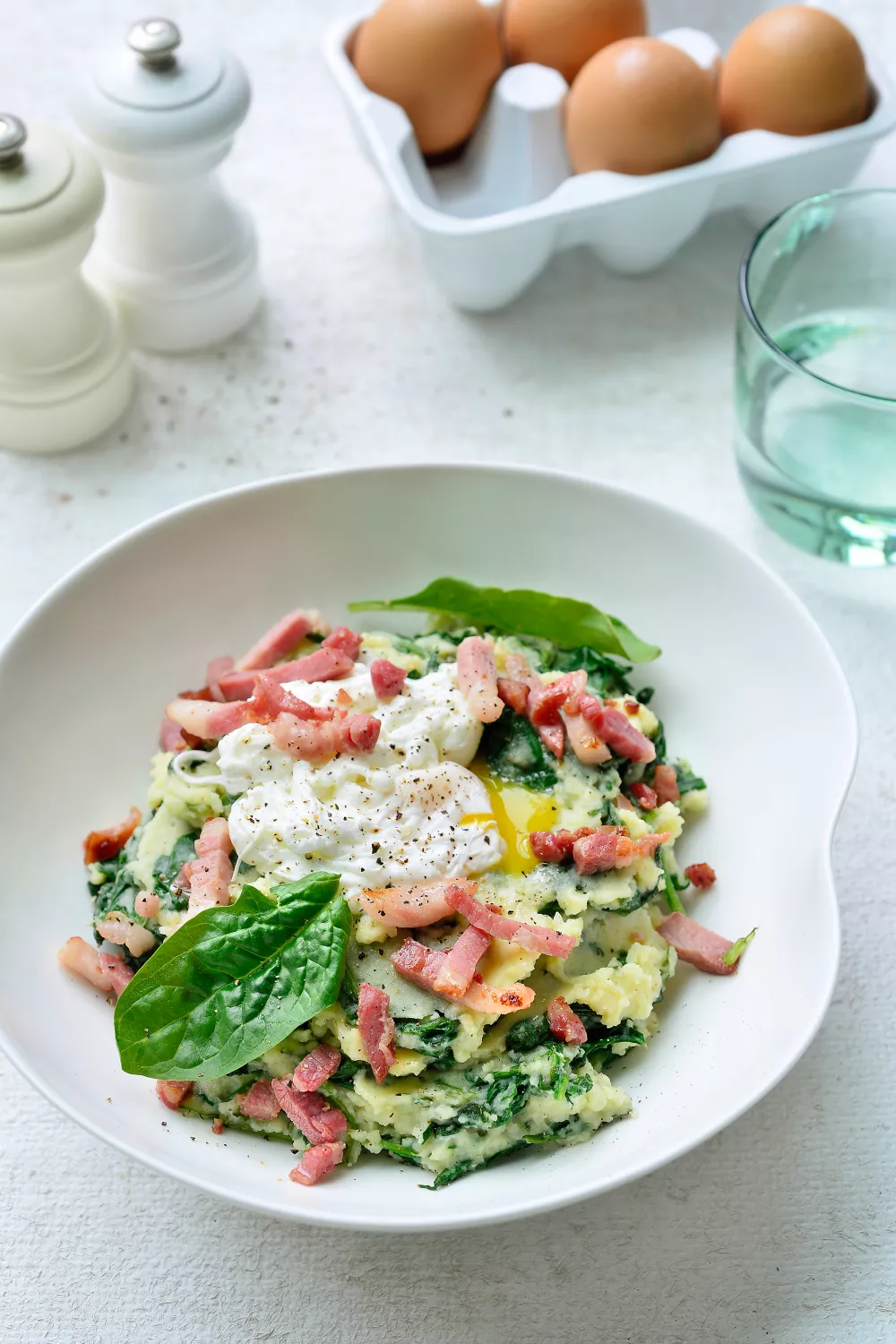 Stappenplan om recept “Spinaziestoemp met spekblokjes en een gepocheerd eitje” te bereiden