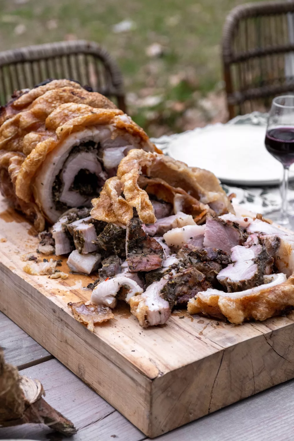 Haal de porchetta van het spit, verwijder het keukentouw en snijd in plakken alvorens te serveren.