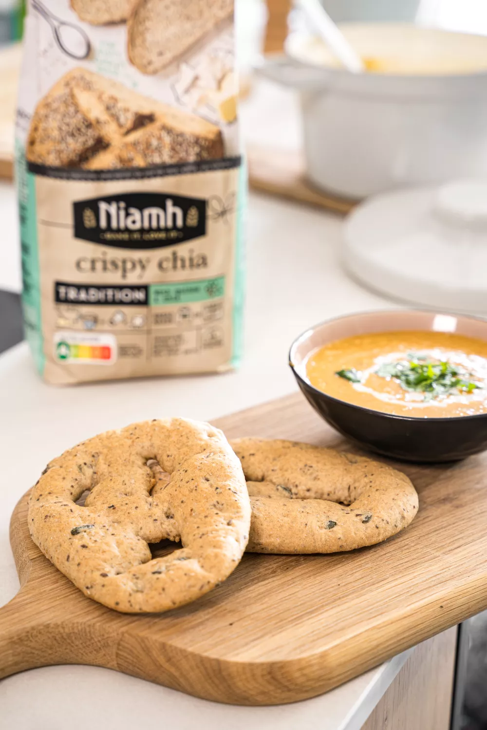 Perfect voor een knusse herfstavond of een speelse Halloweenmaaltijd: romige butternutpompoensoep met kokosmelk en verse koriander, licht gekruid met kippenbouillon en een pittige toets van groene chili. De spookbroodjes van Niahm Crispy Chia Mix worden gekneed, laten rijzen en goudbruin gebakken en vormen het ideale dipbroodje bij de soep. Een eenvoudig comfortfoodgerecht met stoven, pureren en bakken dat jong en oud zal verrassen.