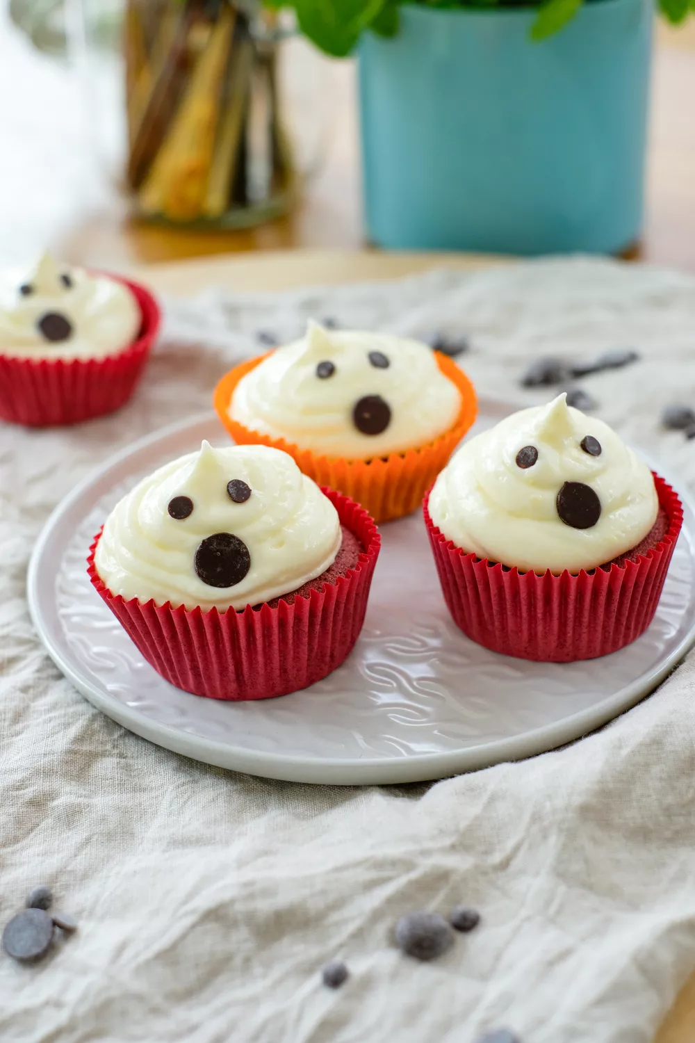 Deze luchtige red velvet cupcakes met romige roomkaasfrosting en krokante chocoladechips zijn perfect voor Halloweenfeestjes in de herfst of elk gezellig bakmoment. Met cacao, een vleugje rode kleurstof en een eenvoudige keukenrobot zet je in een handomdraai twaalf cakejes in de oven. Werk ze af met toefjes frosting en grote en kleine chocoladechips voor speelse spookjes.