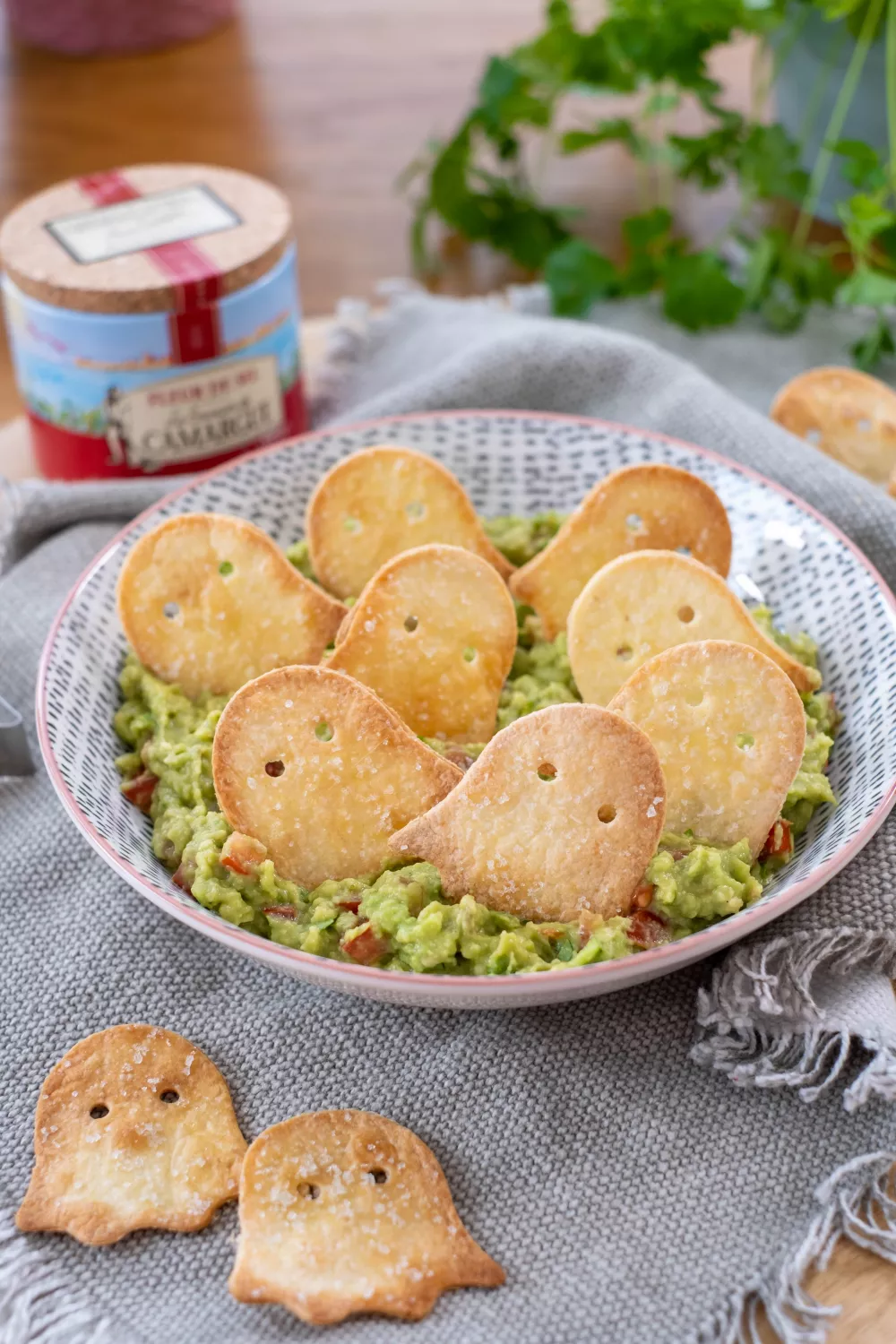 Stans met een vormpje spookjes uit de tortillavellen en maak met een metalen rietje de oogjes. Leg de spookjes op een met bakpapier beklede bakplaat, bestrijk ze met een laagje olijfolie en bestrooi ze met fleur de sel. Bak de spookjes vervolgens ongeveer 5 à 8 minuutjes in een voorverwarmde oven op 200 graden tot ze goudbruin zijn.