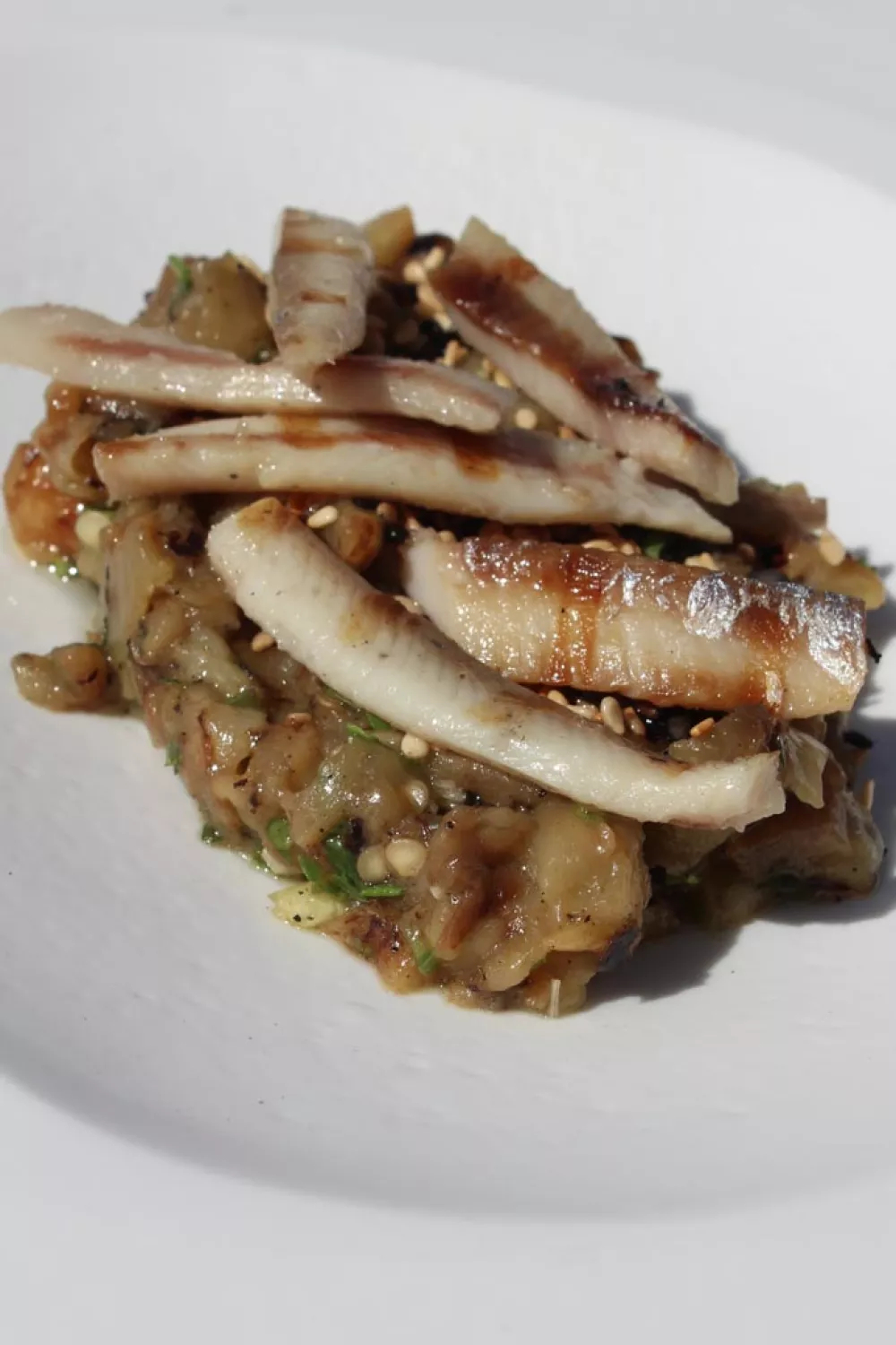 Gegrilde sprotfilets op een romige tapenade van aubergine met geroosterde sesam, fijngehakte look, citroen en verse koriander en munt vormen een fris en hartig visvoorgerecht. Het korte grillen en het roosteren van sesamzaad geven rokerige tonen en een knapperige textuur, perfect voor een zomerse barbecue, borrel of lichte lunch. Een schepje tapenade en een scheut olijfolie maken het geheel af.