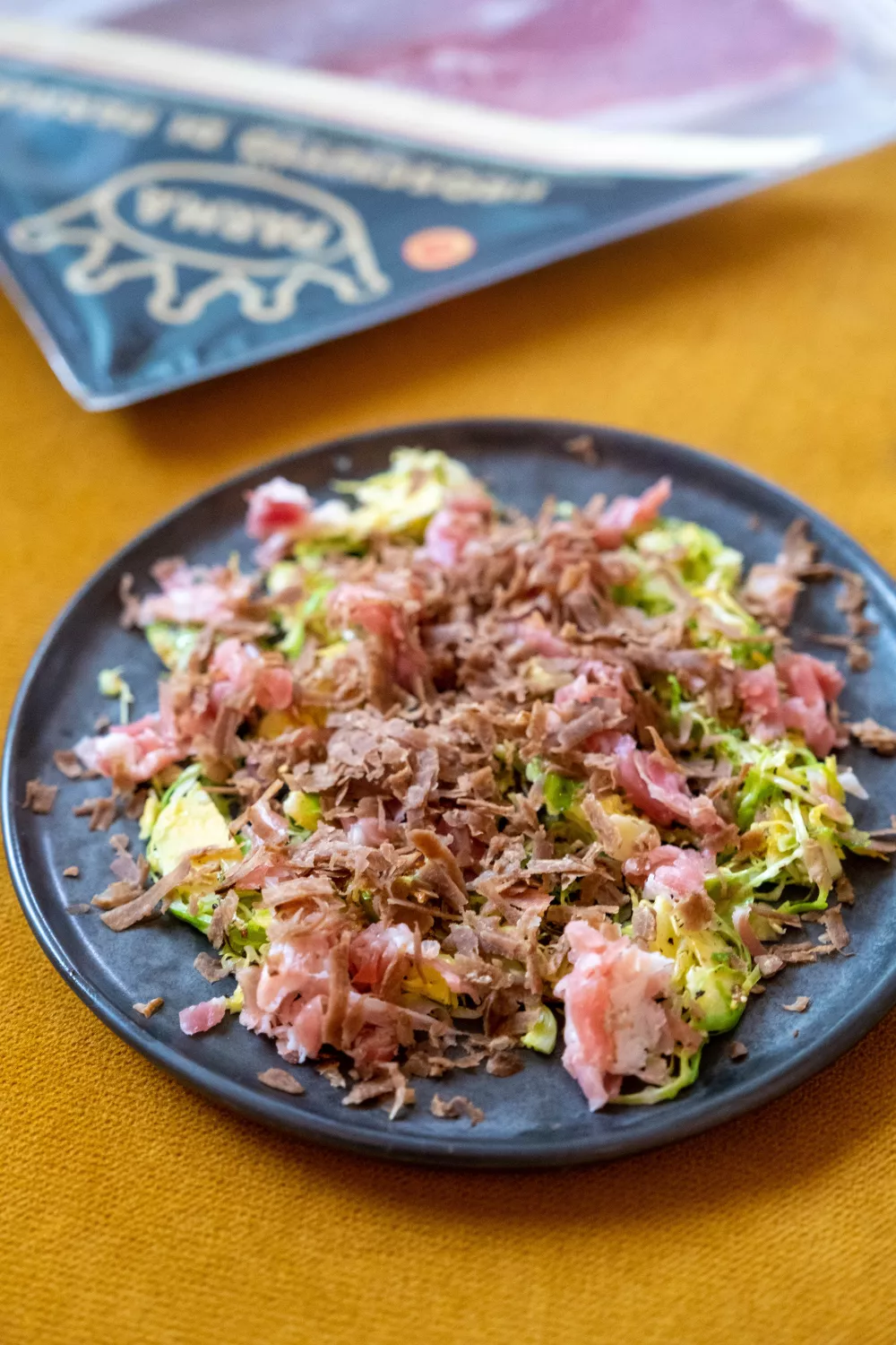 Snijd de Parmaham in reepjes. Verdeel over de spruitjes. Werk het hapje nog af met geraspte wintertruffel.