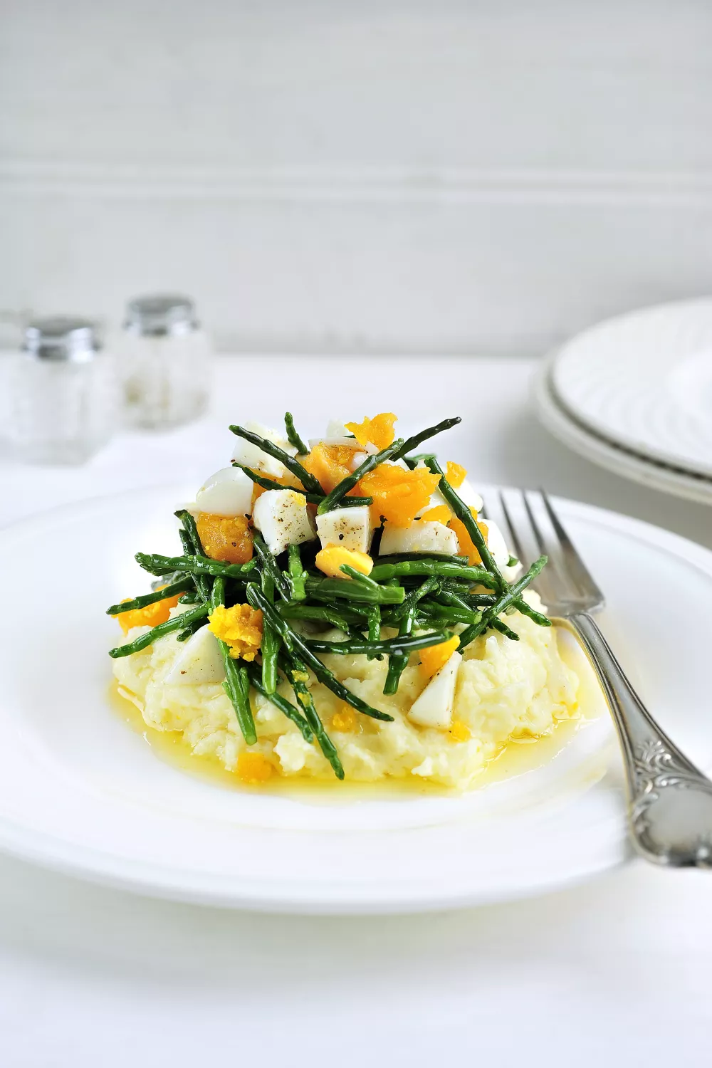 Romige stamppot van aardappel met een frisse, zilte toets van zeekraal en een zachte eiersaus, een hartig gerecht met een kustachtige geur en rijke boterigheid. De aardappelen worden fijn geprakt met melk en boter tot een zijdeachtige puree, de zeekraal kort gestoofd en de eieren medium gekookt voor een smeuïge saus. Afgewerkt met zure room en een snufje nootmuskaat is dit ideaal voor een lente of zomeravond aan tafel.