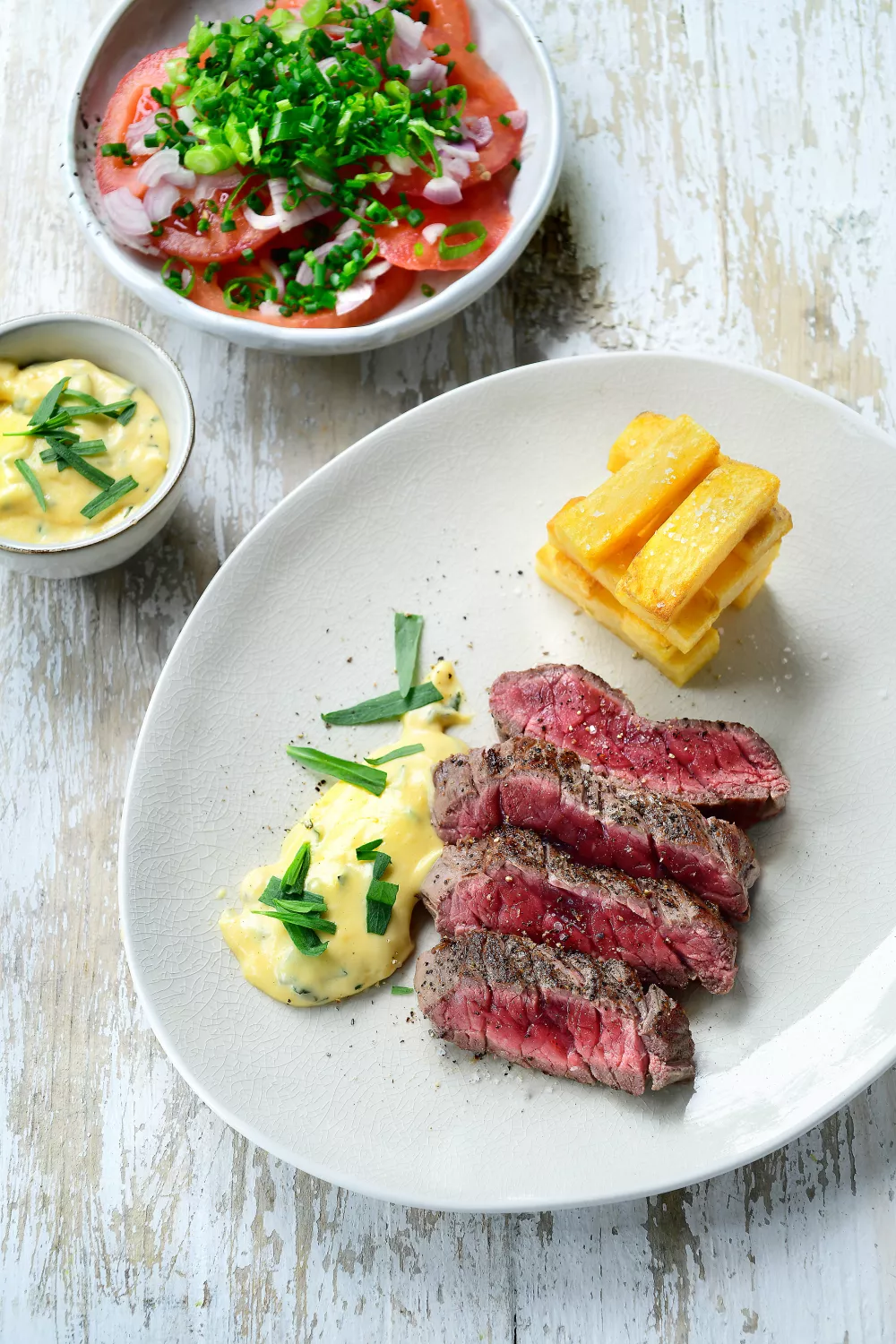 Serveer de steak met de bearnaisesaus, een torentje van de pommes pont neuf en de tomatensalade.