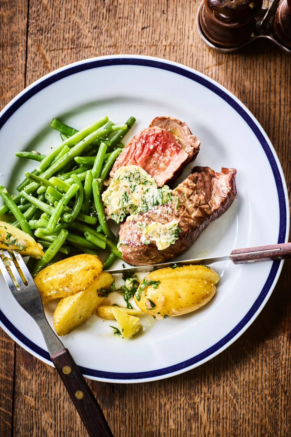 Leg op elk bord een steak en schep er een portie krieltjes en prinsessenbonen naast. Werk de steaks af met een toef ravigotteboter.