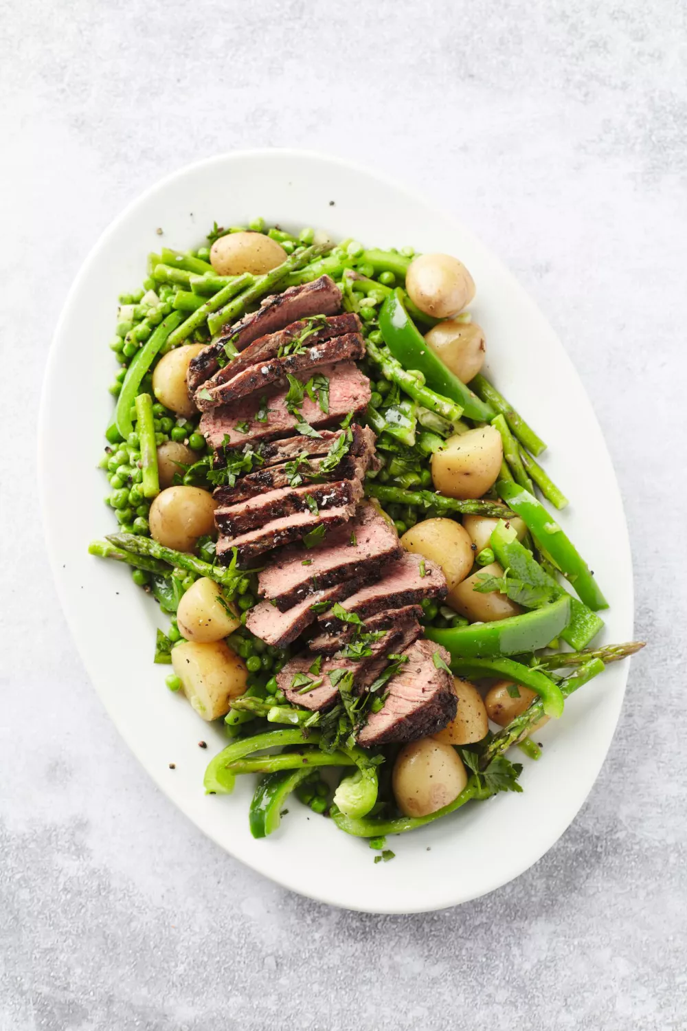 Steak Primavera combineert sappige biefstuk met knapperige voorjaarsgroenten, erwten, asperges en geroosterde krielaardappeltjes tot een kleurrijk en hartig gerecht. Je schroeit het vlees kort dicht, laat het rusten en gebruikt de aanbaksels om knoflook, lente-ui, paprika, erwten en asperges te sauteren voor extra smaak. Perfect als snelle doordeweekse maaltijd of als feestelijk lentegerecht, afgewerkt met verse peterselie.