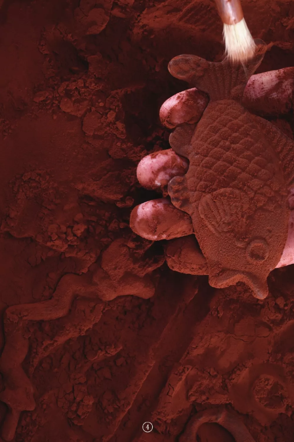 Druk voorzichtig met een dienblad het cacaopoeder aan. Druk nu de figuur die je wilt maken in het poeder en probeer hem te verwijderen zonder de vorm in het cacaopoeder te beschadigen.