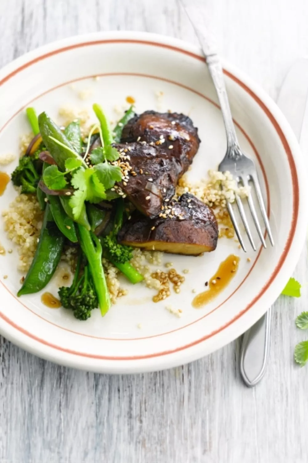 Serveer de geroosterde seitan met de roerbakgroenten, quinoa en sesamzaadjes.