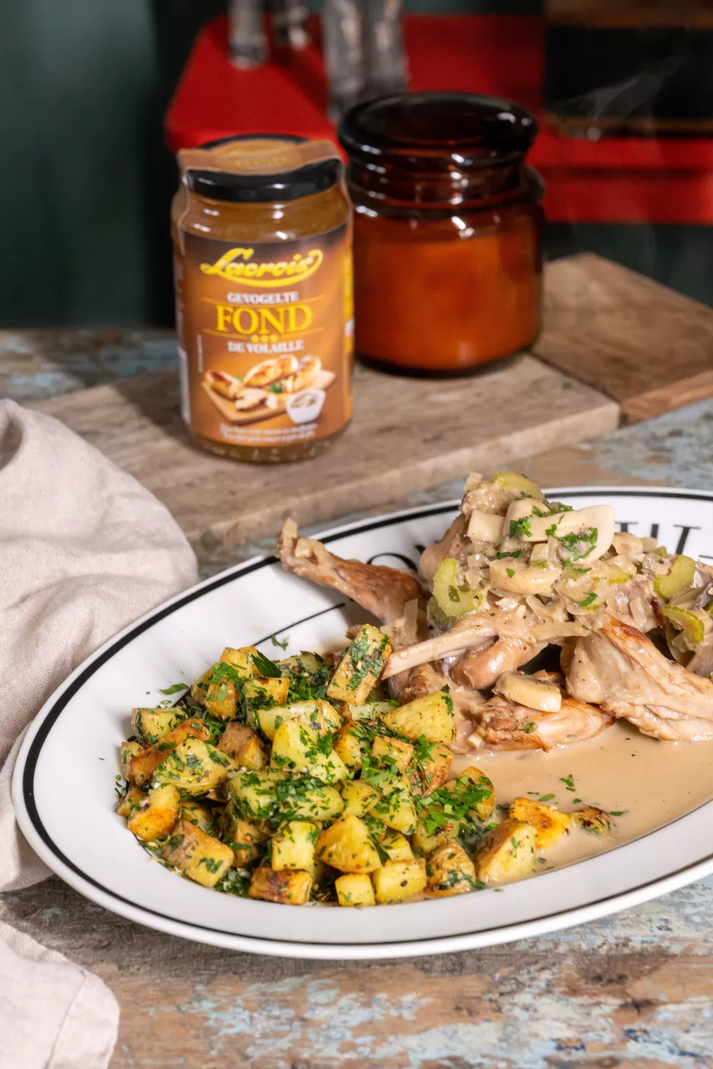 Dit stoofpotje van konijn met Lacroix gevogeltefond en Maille mosterd is pure klassieker op z’n best. Mals konijn, romige saus en een vleugje cognac zorgen voor een volle, rijke smaak. Perfect met krokante aardappeltjes voor een feestelijk of gezellig weekenddiner.