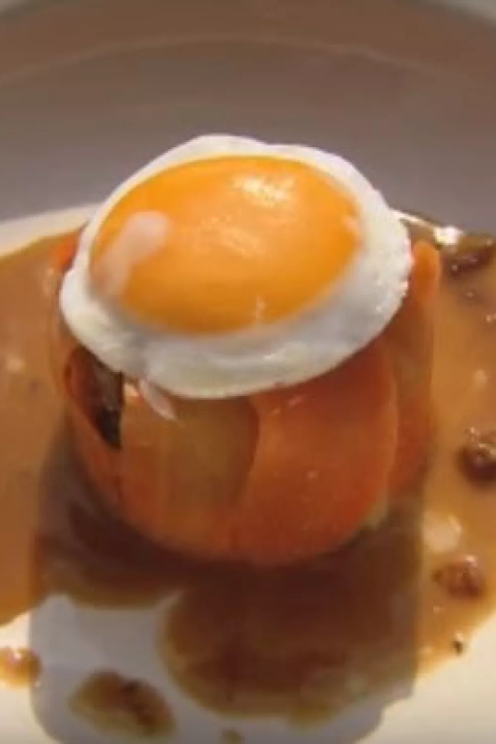 Bak een spiegeleitje en steek met het uitsteekvormpje een cirkel uit het spiegelei. Leg het eitje bovenop het gerechtje en lepel er wat saus rond.