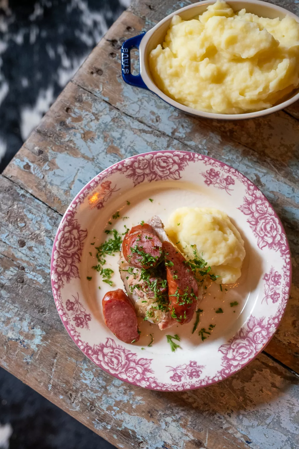 Hartverwarmend stoofpotje van zuurkool en varkensvlees met gerookte spekblokjes en Poolse worsten, perfect voor koude winteravonden. Het vlees krijgt kleur in boter en suddert zacht in de oven samen met de zuurkool, waardoor smaken zich mengen tot een robuuste, lichtzure jus. Serveer met romige aardappelpuree waaraan gestoofde appeltjes zijn toegevoegd voor een zoete tegenhanger, ideaal als familiehap of zondagse maaltijd.