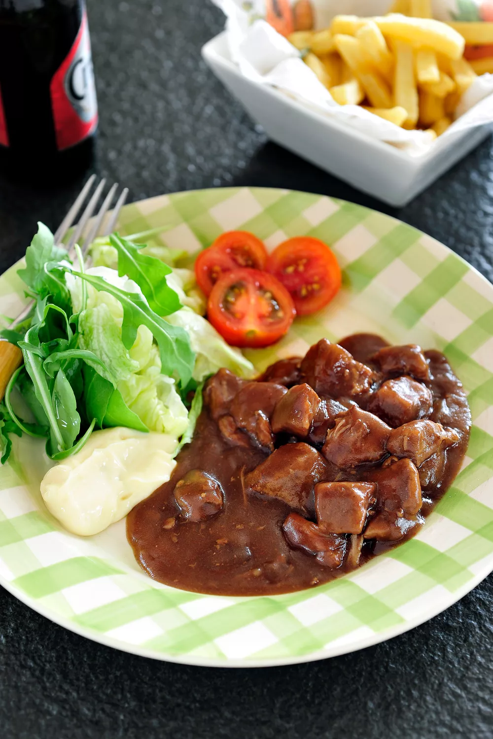 Dit klassieke Vlaams stoofvlees met donker tafelbier en kandijsuiker levert warme, complexe smaken die perfect passen bij gezellige winter of weekendmaaltijden. Door eerst de ui te fruiten en het vlees te kleuren en daarna zacht en lang te laten sudderen met laurier en vleesfond wordt het vlees boterzacht en vol van smaak. Serveer met handgesneden, tweemaal gebakken frieten voor een nostalgische bistroervaring en ultiem comfort food.