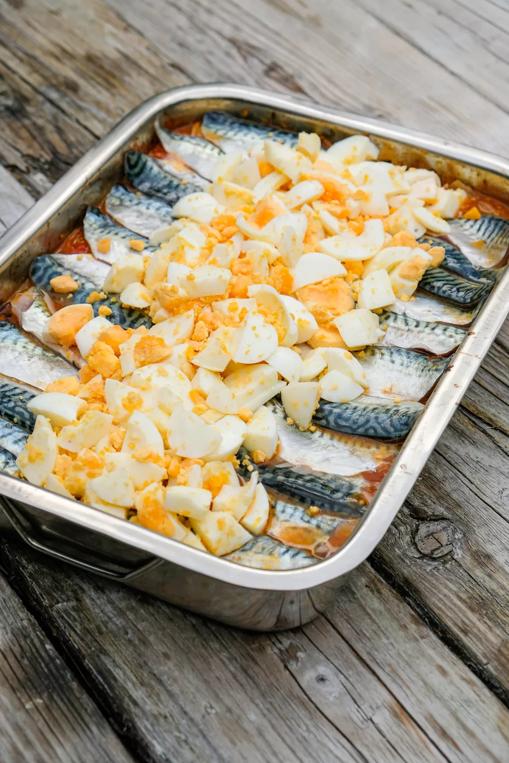 Rustieke ovenschotel met malse makreelfilets, zoete kerstomaatjes en stukjes hardgekookt ei, op smaak gebracht met gerookt paprikapoeder, ui en knoflook. Het roosteren in de oven karamelliseert de ui en concentreert de tomatensmaken, terwijl de vis er vlak tegen het einde bij komt voor een korte, zachte garing. Perfect als snelle, gezonde mediterrane maaltijd voor een informele weekavond, zomerse lunch of licht diner.
