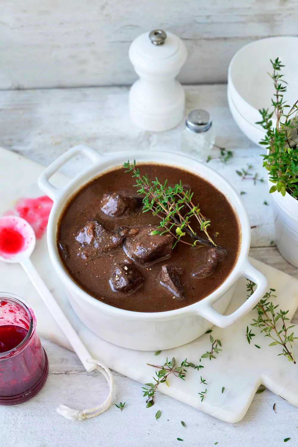 Deze rijke stoverij van ree combineert mals wildvlees met rode wijn, wildfond en een vleugje pure chocolade voor een diepe, hartige smaak. Veenbessencompote en met mosterd ingesmeerde peperkoek geven een zoetzure en kruidige toets die ideaal is voor herfstige of winterse diners. Het vlees wordt eerst aangebraden en daarna langzaam gesudderd tot het boterzacht is, perfect voor een feestelijk of troostrijk maal.