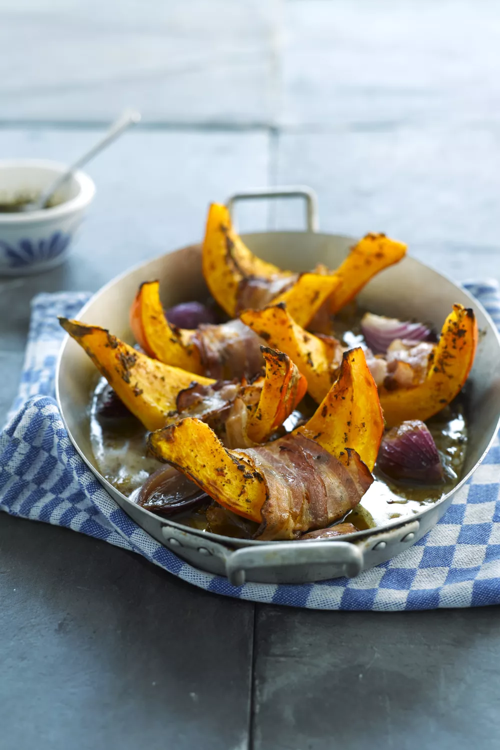 Snijd de ongeschilde pompoen en uien in partjes en verwijder de pitten en draadjes. Meng het verkruimelde pepertje met de salie, zout, kaneel en olijfolie tot een homogeen mengsel. Smeer de pompoen hiermee in en wikkel het spek erom.