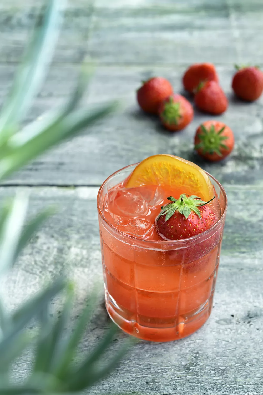 Werk de cocktail af met een verse aardbei en een schijfje gekonfijte (of gedroogde) sinaasappel.
