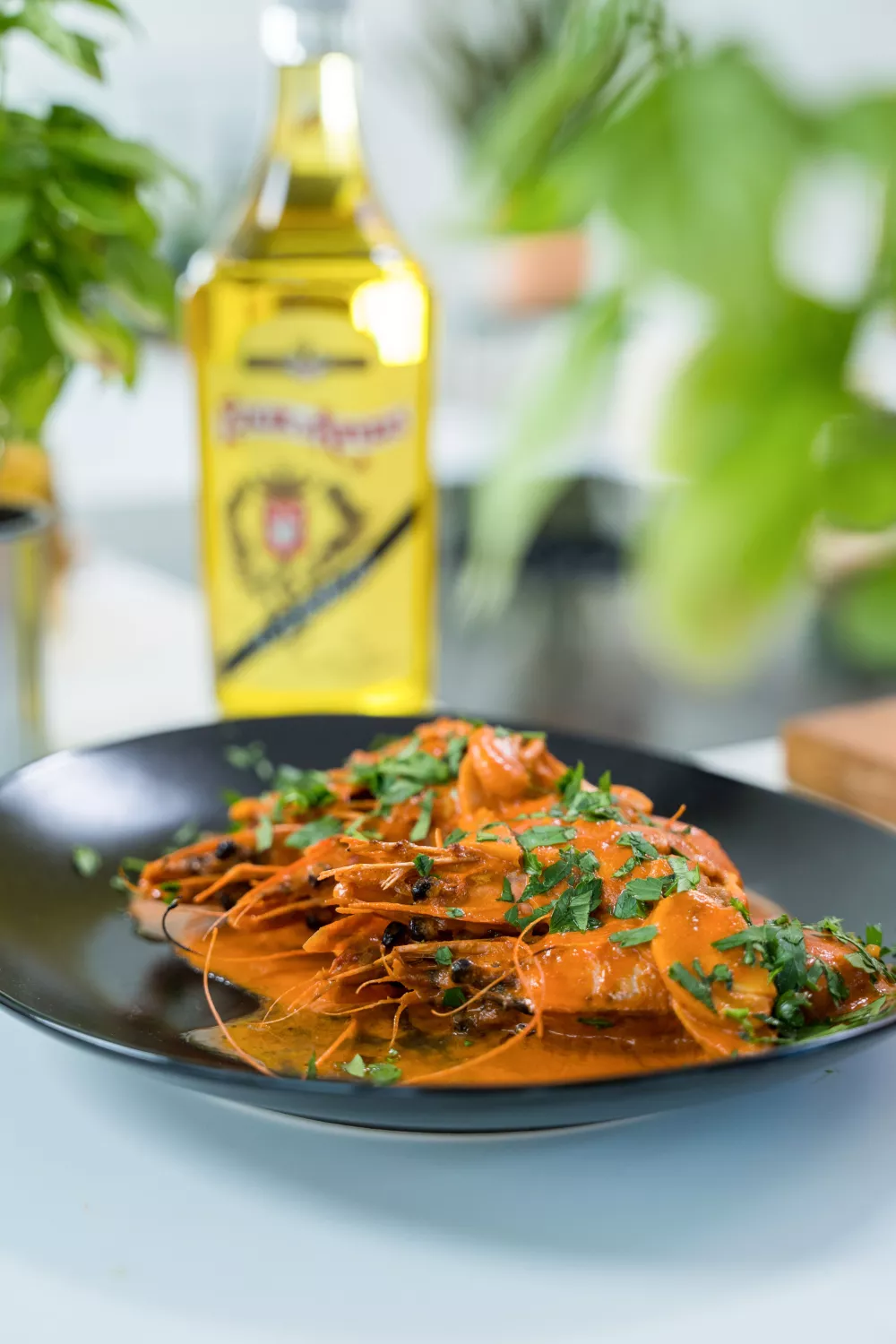 Verhit een scheut olijfolie in een pan op het vuur. Bak er de tijgergarnalen in. Draai ze om als ze roze beginnen te worden en bak ook de andere kant aan. Giet het vet uit de pan en zet deze terug op het vuur. Blus de pan met een scheut Elixir D’Anvers en flambeer de tijgergarnalen. Giet er daarna de saus over.