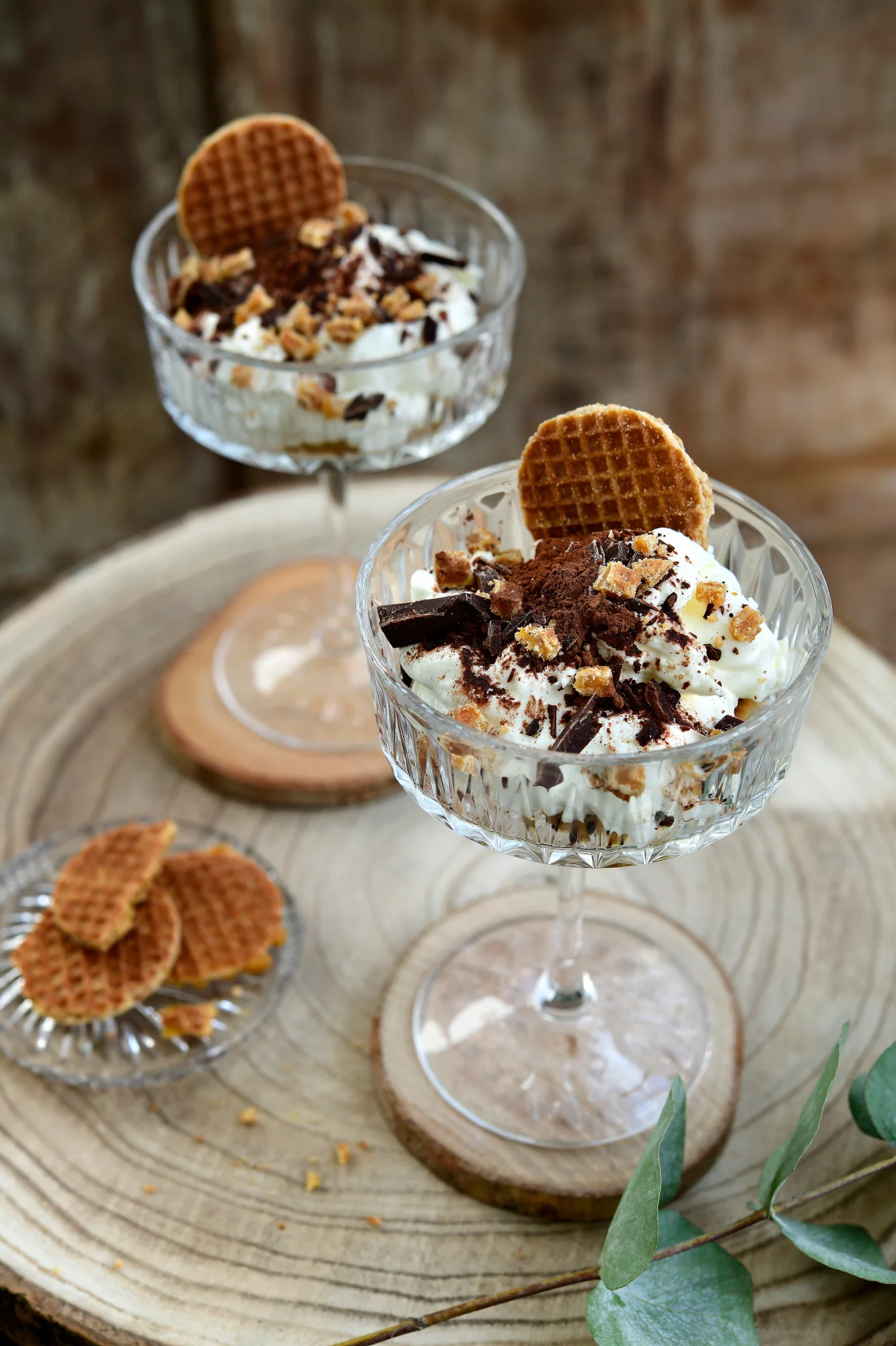 Steek in elk glaasje nog een laatste stroopwafeltje en serveer.