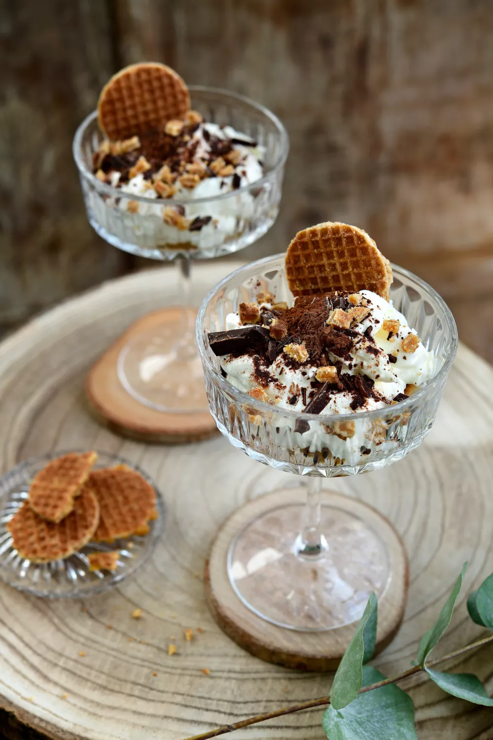Neem mooie champagnecoupes en leg in elk glaasje 4 van de stroopwafeltjes. Schep er wat van het mascarponemengsel bovenop. Laat minimum 1 uur opstijven in de koelkast.