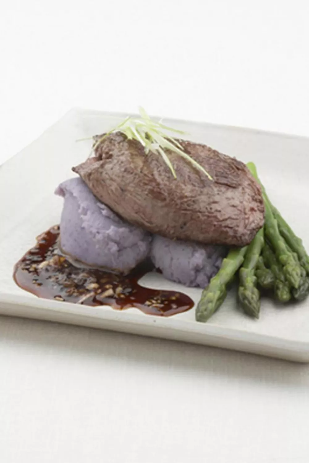 Serveer de struisvogelfilet met de saus, de asperges en een beetje truffelpuree. Versier met de lente-ui.