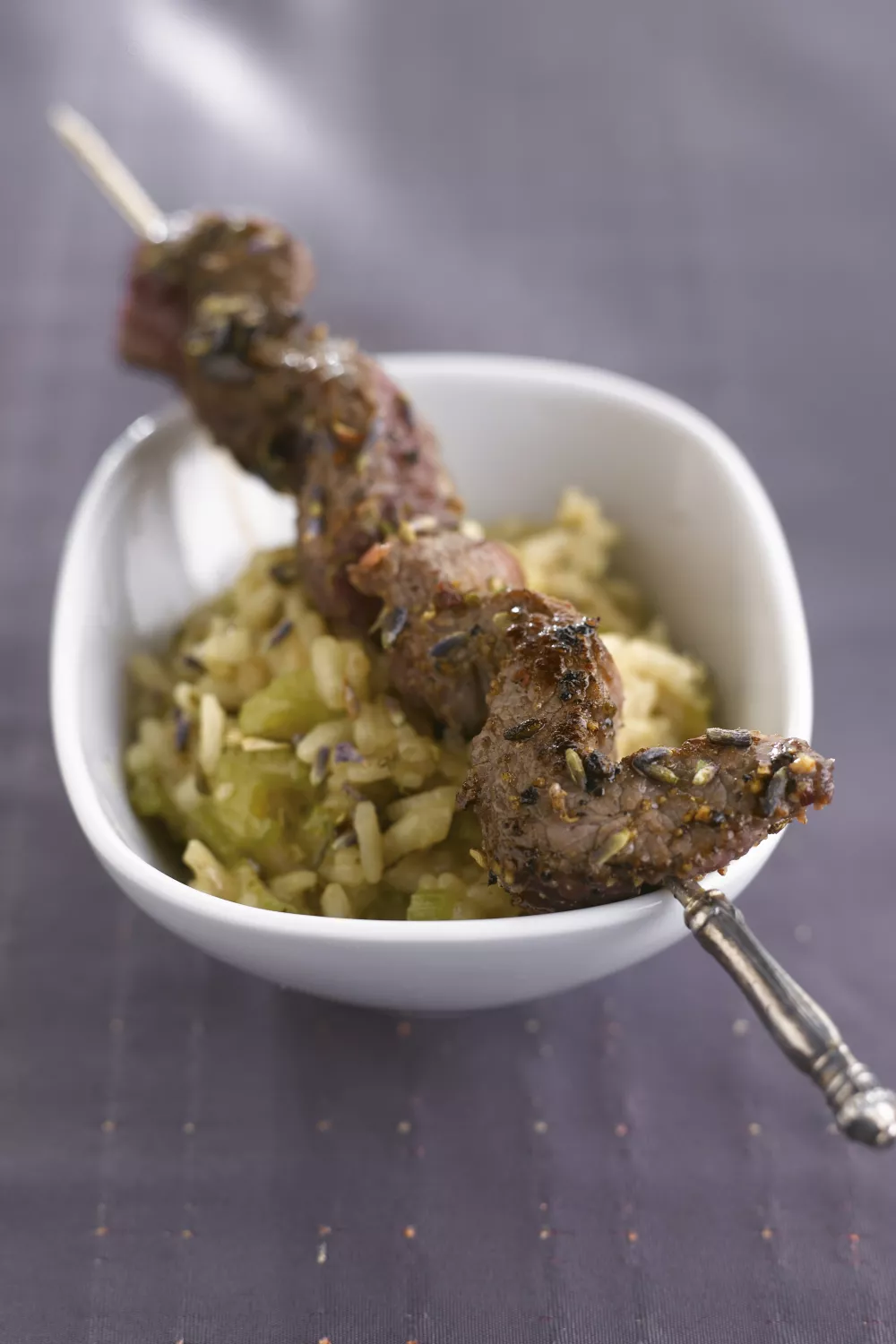 Rijg de struisvogelreepjes op een stokje en bak de satés à point. Serveer onmiddelijk met de risotto.