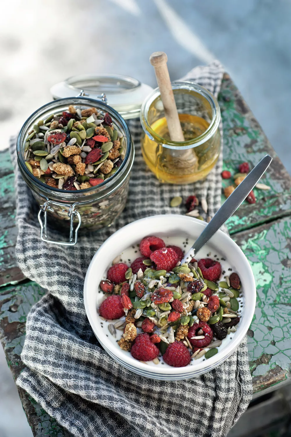Deze kleurrijke superzadenmix combineert knapperige pompoenpitten en zonnebloempitten met voedzame chiazaden en zoete witte moerbeien, gojibessen en gedroogde cranberries voor een energierijke, lichtzoete bite. Perfect als gezond tussendoortje of als krokante topping op yoghurt, havermout of salades en ideaal om mee te nemen in je lunchpakket. Makkelijk te maken: simpel mengen en luchtdicht bewaren, zo staat er altijd een voedzame basis klaar die rijk is aan magnesium en selenium.