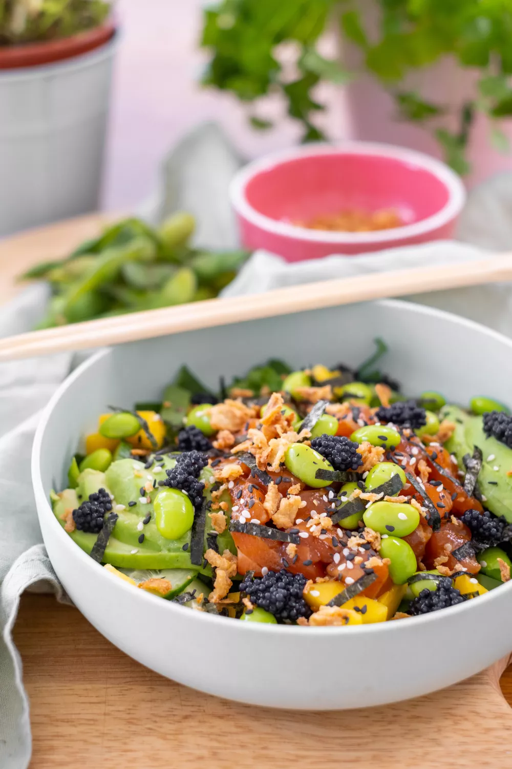 Werk de salade af met enkele toppings: gesnipperde nori, sesamzaadjes, gebakken ajuintjes en viseitjes.