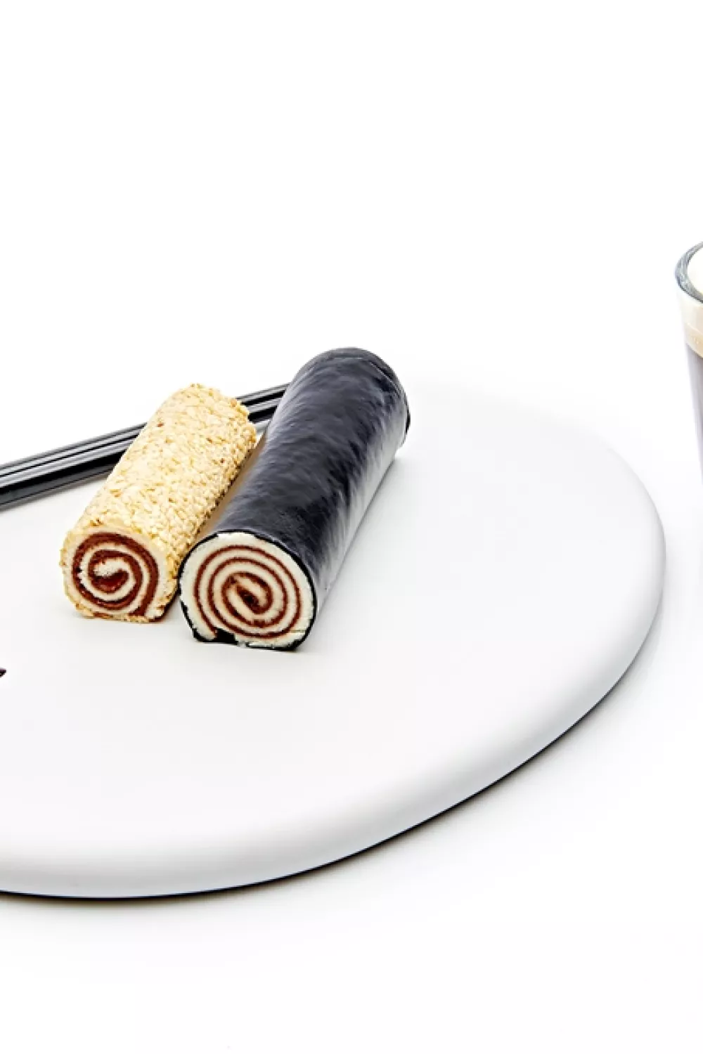 Sushi van wit brood met hazelnootpasta, Fortissio Lungo koffiegelei, pure chocolade en hazelnootcrunch is een speels dessert of zoet hapje voor een feestelijke borrel of een winterse koffiemiddag. Door broodreepjes plat te rollen, strak op te rollen en kort te bevriezen ontstaan stevige rolletjes met contrast tussen romige pistachemayonaise en krokante sesam. Roosteren, karameliseren en spuitzaktechnieken tillen dit recept naar een elegante presentatie.