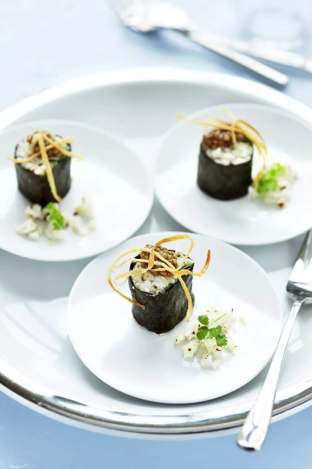 Knapperige, umami-rijke sushi van wortelpeterselie met romige geitenkaas en een subtiele wasabitoon, afgewerkt met hazelnoot voor extra textuur. De 'rijst' van fijngehakte wortelpeterselie wordt op smaak gebracht met rijstazijn en mirin, terwijl huisgemaakte mosterdkaviaar en krokant gebakken julienne voor verrassende contrasten zorgen. Ideaal als verfijnde borrelhap of licht voorgerecht bij lente- en herfstmenu's.