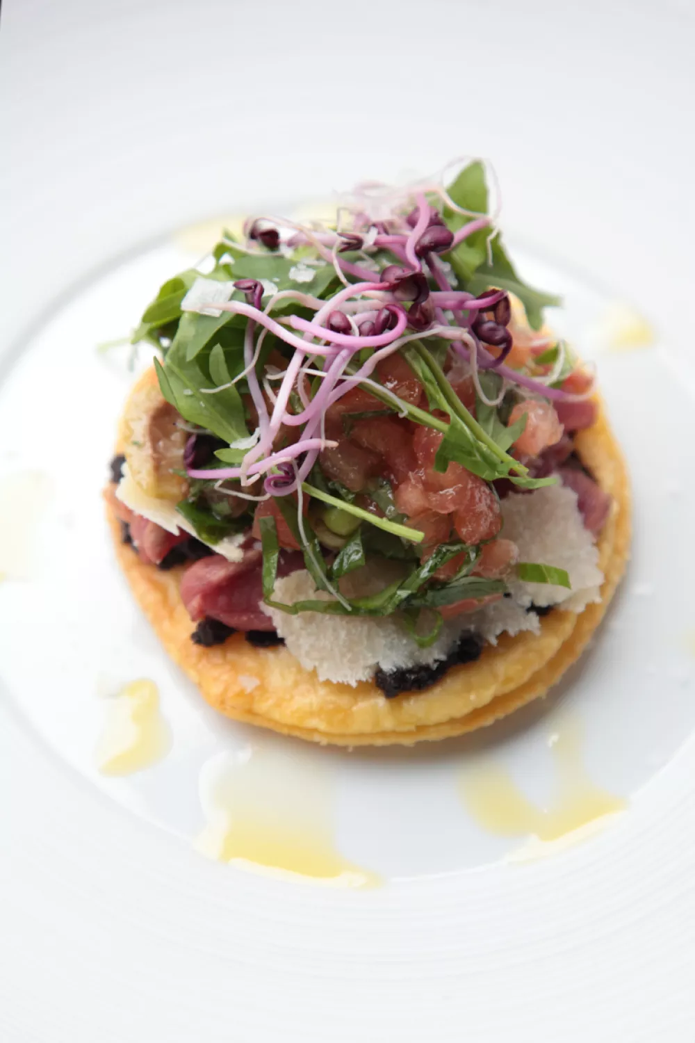 Een knapperig bladerdeegtaartje met malse plakjes tonijn en zonnige tomaat, afgewerkt met rucola, Parmezaan en rode biet scheutjes. De geblancheerde tuinbonen, olijven en basilicum geven een frisse mediterrane toets, met olijventapenade en tomatensaus, terwijl je het deeg krokant bakt tussen twee bakplaten en de vis kort in de oven gaart. Perfect als zomers voorgerecht, elegante lunch of smakelijk hapje bij een glas wijn.