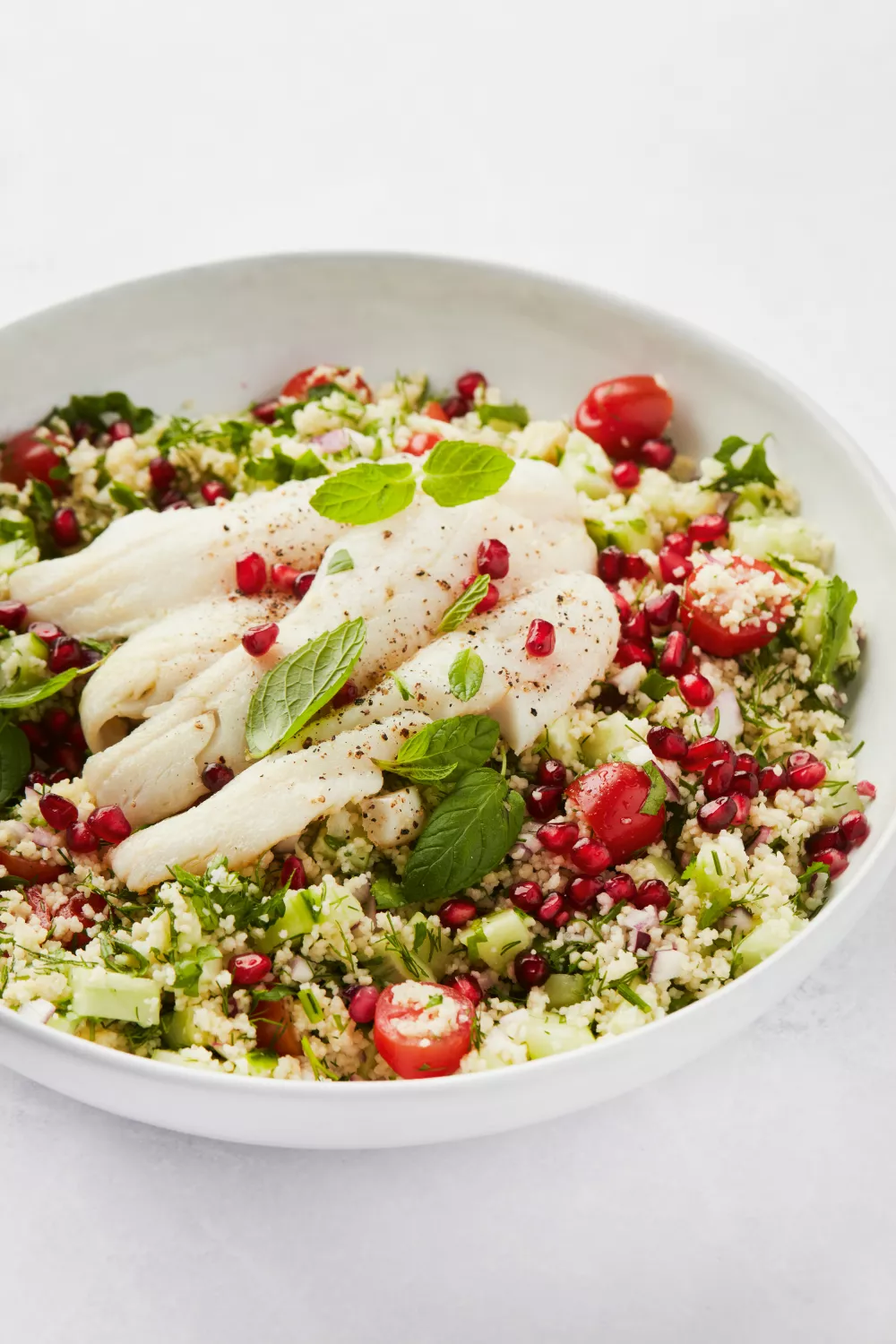 Deze taboulé met wijting is een fris en gezond gerecht dat zomerse smaken perfect combineert. De luchtige couscoussalade met vis, verse kruiden en granaatappelpitten maakt van dit lichte hoofdgerecht een heerlijke keuze voor wie houdt van een gezonde en snelle maaltijd vol kleur en smaak.