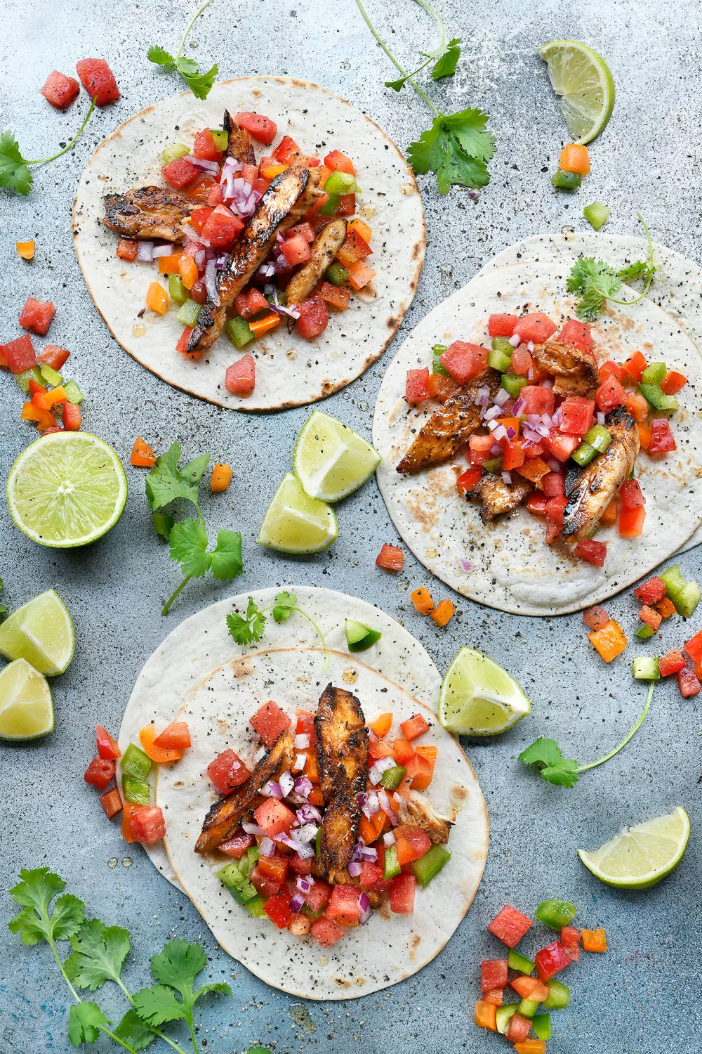 Verdeel de kippenreepjes over de taco’s en werk af met de salsa van watermeloen en extra koriander.