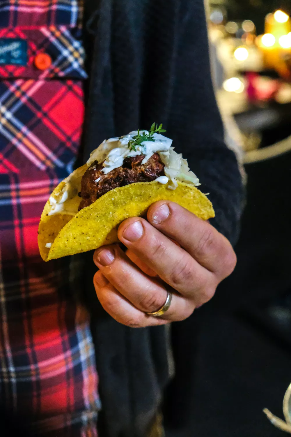 Vul de tacoschelpen met de koolsla en de lamsburgers. Werk af met het sausje.
