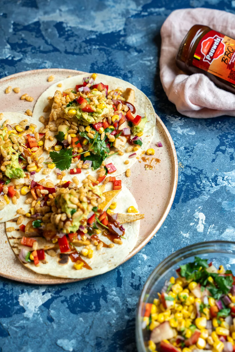 Verhit een scheutje olijfolie in een pan op het vuur en bak er de rice crispies krokant in. Kruid met paprikapoeder, peper en zout. Verwarm de tortilla’s kort in een droge pan. Leg ze op een bord en verdeel er de plakjes quorn, de maïssalsa en de avocado over. Werk nog af met de krokante rice crispies en een lepel BBQ-saus alvorens te serveren.
