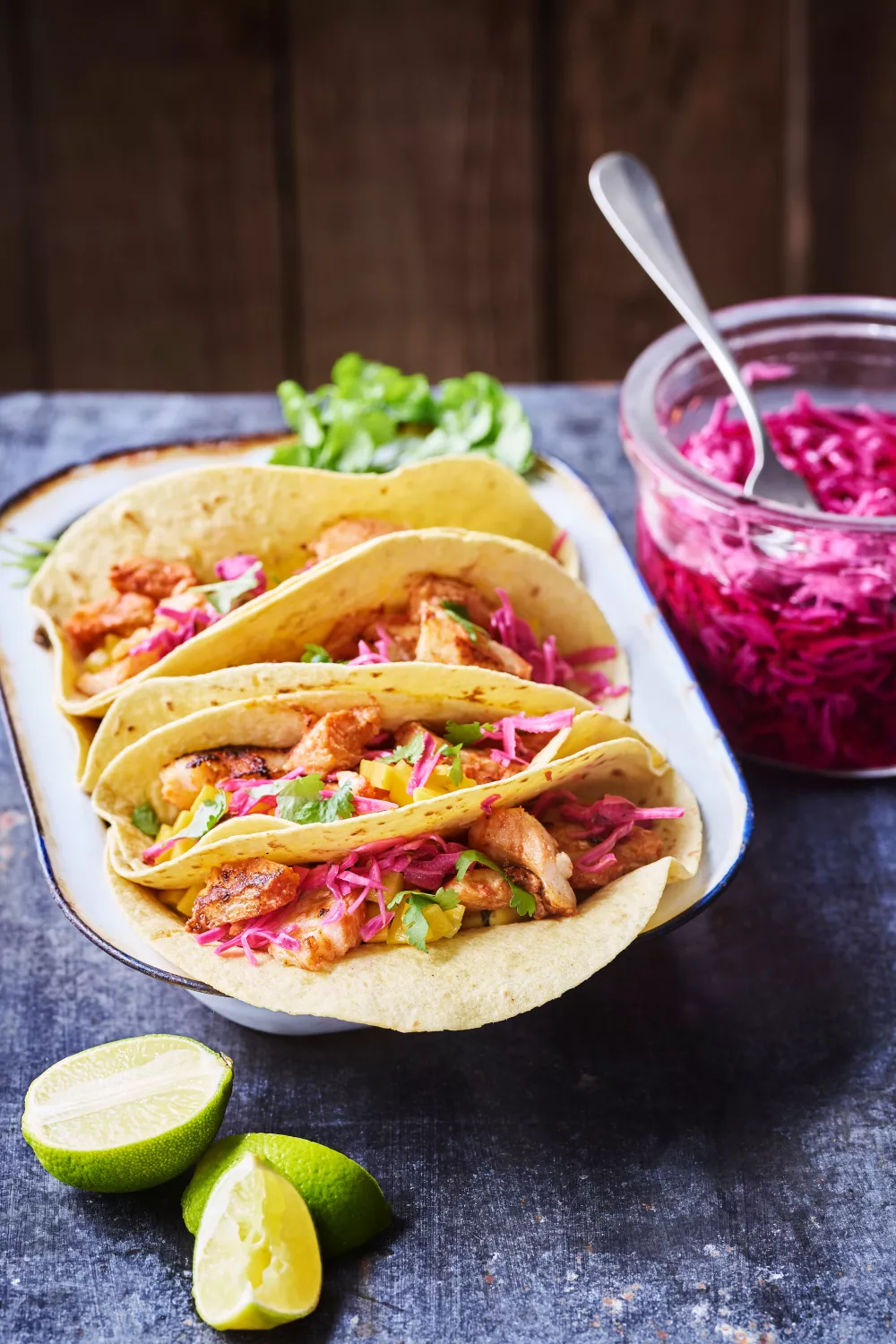 Frisse taco's met wijting, pittige mangosalade en ingelegde rodekool brengen zomerse smaken en knapperige texturen in één snelle streetfoodmaaltijd. De vis wordt kort en heet gebakken met komijn voor een aromatische bite, terwijl tortilla's geroosterd en de rodekool snel gepekelde zuurheid krijgt door wittewijnazijn. Perfect als lichte avondmaaltijd of voor een informele borrel met vrienden.